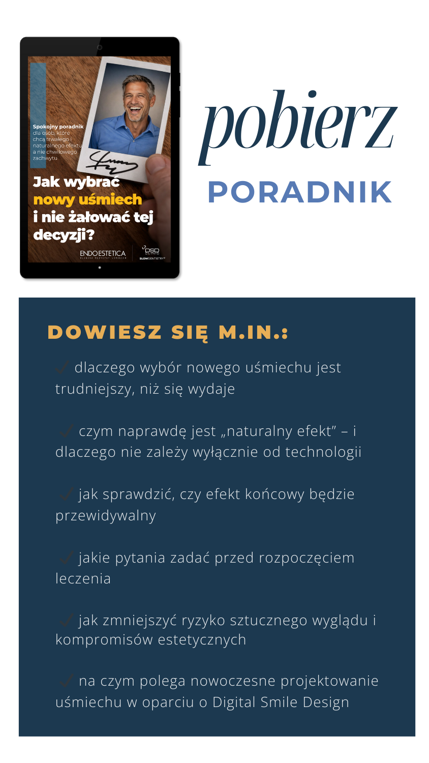 Ten poradnik został opracowany z perspektywy nowoczesnej stomatologii projektowej. Wyjaśnia, w jaki sposób podejmowane są kluczowe decyzje estetyczne, jak powinna wyglądać diagnostyka i planowanie leczenia oraz dlaczego przewidywalność efektu zależy nie tyle od samej technologii, co od struktury całego procesu.