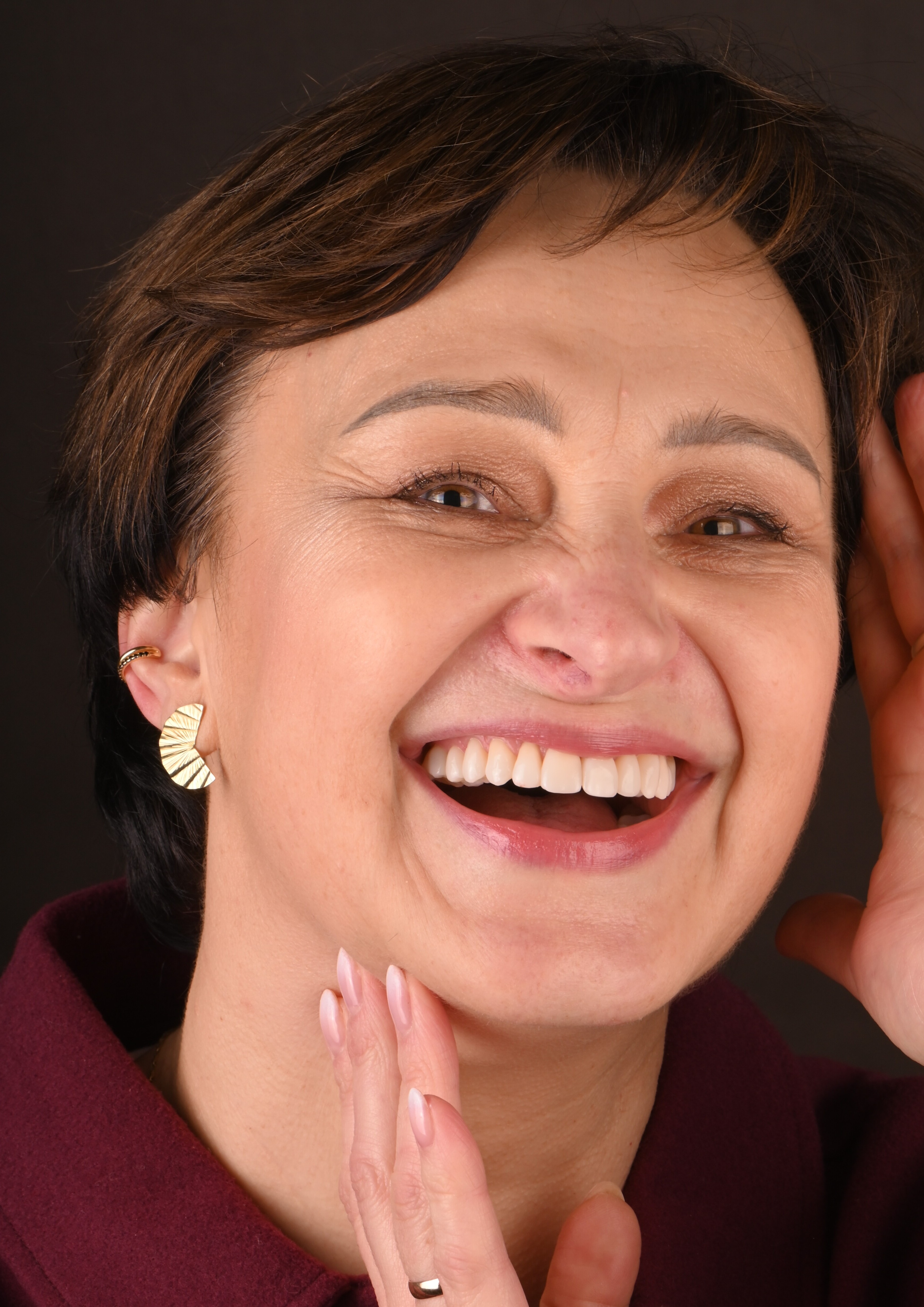 Finalizacja leczenia to moment, w którym uśmiech Lucyny zyskał swój ostateczny kształt – naturalny, zgodny z jej osobowością i komfortowy w codziennym funkcjonowaniu. Przy pomocy technologii robotycznej oraz bibliotek naturalnych zębów stworzyliśmy wykończenia idealnie dopasowane do jej cech twarzy i stylu życia.